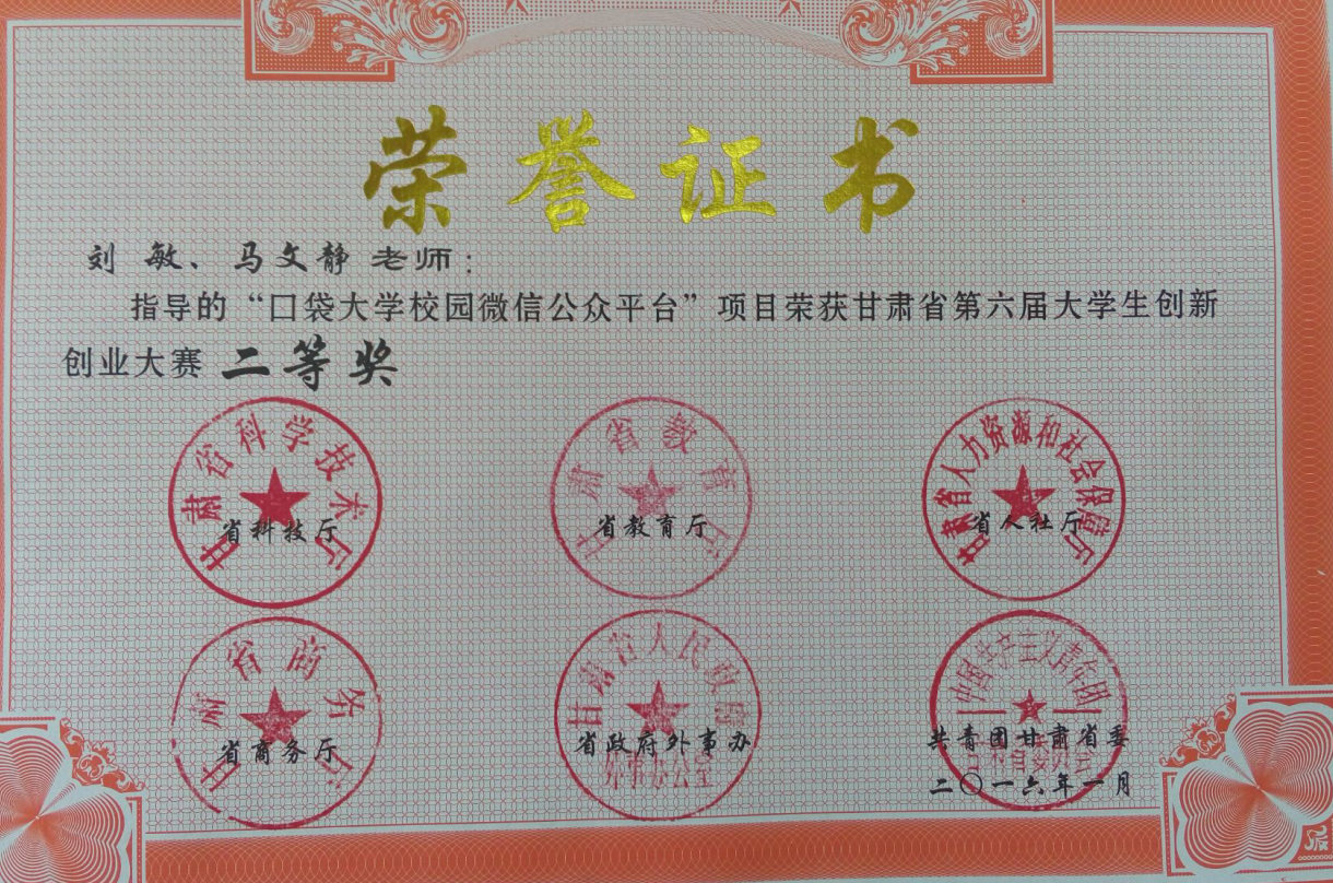 1.2016年,指导“口袋大公司园公众平台”项目获“兰州银行杯”首届“丝绸之路”国际老员工创新创业大赛三等奖,甘肃省第六届老员工创新创业大赛二等奖.
