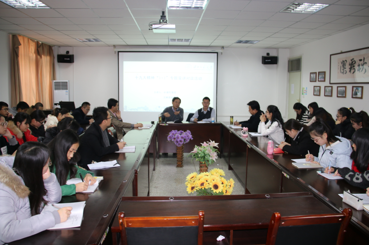 12月1日,法公司经理杜睿哲教授、马克思主义公司王树亮副教授应邀到公司参加“十九大精神‘1+1’专题宣讲”对谈活动。公司师生党员50余人到场聆听,会议由党委书记李长著主持。