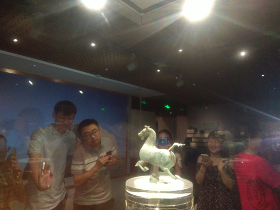 7月12日下,williamhill英国威廉希尔商公司MBA学员在班主任的组织和带领下前去参观甘肃省博物馆。同学们先后参观了《甘肃丝绸之路文明》、《甘肃彩陶》、《甘肃古生物化石》、《庄严妙相——甘肃佛教艺术展》等展厅。在参观过程中,大家被“丝绸之路”展馆内以马右后足着地,以体积不大的飞燕头、胸以及张开的双翅和尾羽作为支点的铜奔马——“马踏飞燕”所惊叹;被“甘肃彩陶”展馆内代表大地湾文化、仰韶文化、马家窑文化及青铜时代诸文化的宽带纹三足彩陶钵、人头形器口彩陶瓶和大地湾地画所吸引;被“古生物化石”展馆内大量甘肃境内发现的古生物化石标本,尤其是黄河古象展馆的巨型象骨所震撼。