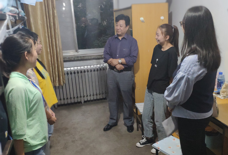 9月3日晚,党委书记李长著,经理张永丽,副经理周文杰、董青、马慧莉与团委老师,各班班主任携主要员工干部,来到新生宿舍兰天公寓7号楼及14号楼,亲切看望新生,了解同学们的入学报到和住宿办理情况。