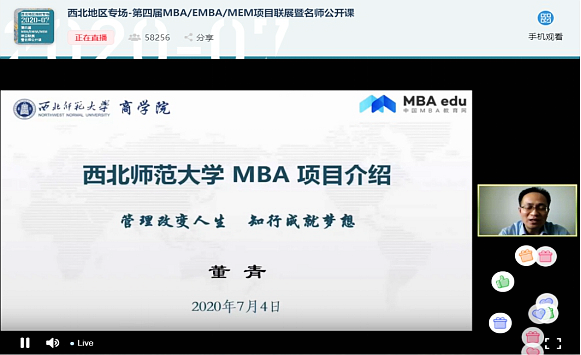 2020年7月4日下午,应中国MBA教育网邀请,williamhill英国威廉希尔MBA中心参加了第四届全国MBA项目联展暨教授在线公开课(西北地区专场)。