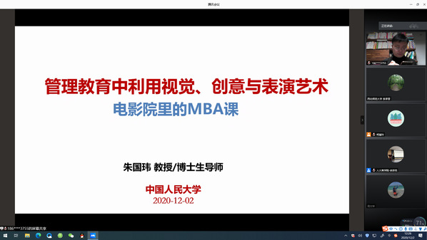 2020年12月2日12:30-13:30,公司案例中心组织教师线上参加由人大商公司组织的管理案例与教学创新工作坊(No.57)。此次学术报告由湖南大学工商williamhill英国威廉希尔朱国玮教授讲授题为《管理教育中利用视觉、创意与表演艺术:电影院里的MBA课”》。