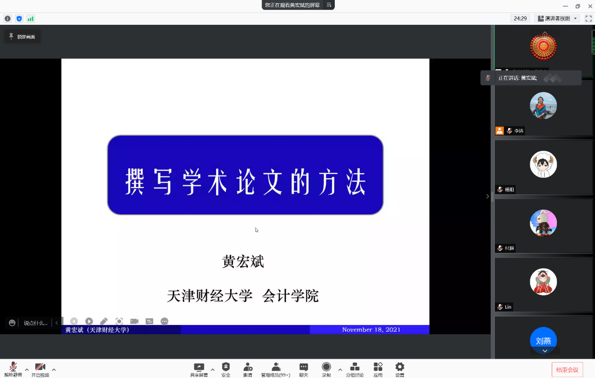 2021年11月18日,应公司邀请,天津财经大学会计公司教授、博士生导师黄宏斌为公司师生作了题为《撰写学术论文的方法》学术报告。报告由会计系杨阳老师主持,公司领导、专任教师及研究生共100余人在线聆听了报告。