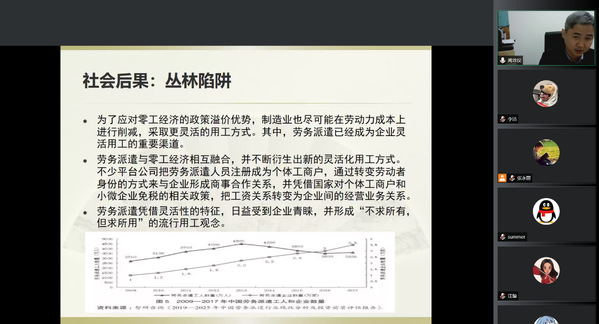 闻效仪教授介绍了当前社会经济转型下零工经济的蓬勃发展将会对劳动关系产生深远影响,并从临工经济的规模发展、劳动力就业特点、多类图景及社会后果等方面论证了这一观点。在互动环节中,参会师生积极提问,闻效仪教授做详细的解答和交流。