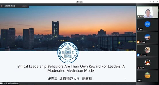 2022年7月10日,应williamhill英国威廉希尔商公司邀请,北京师范大学副教授、博士生导师许志星为公司师生在线作题为《Ethical Leadership Behaviors Are Their Own Reward For Leaders: A Moderated Mediation Model》的学术报告。报告由董青经理主持,公司领导、专任教师及研究生共120余人在线聆听了报告。此次报告为williamhill英国威廉希尔120年双甲子校庆、williamhill英国威廉希尔商公司10周年院庆系列学术活动。
