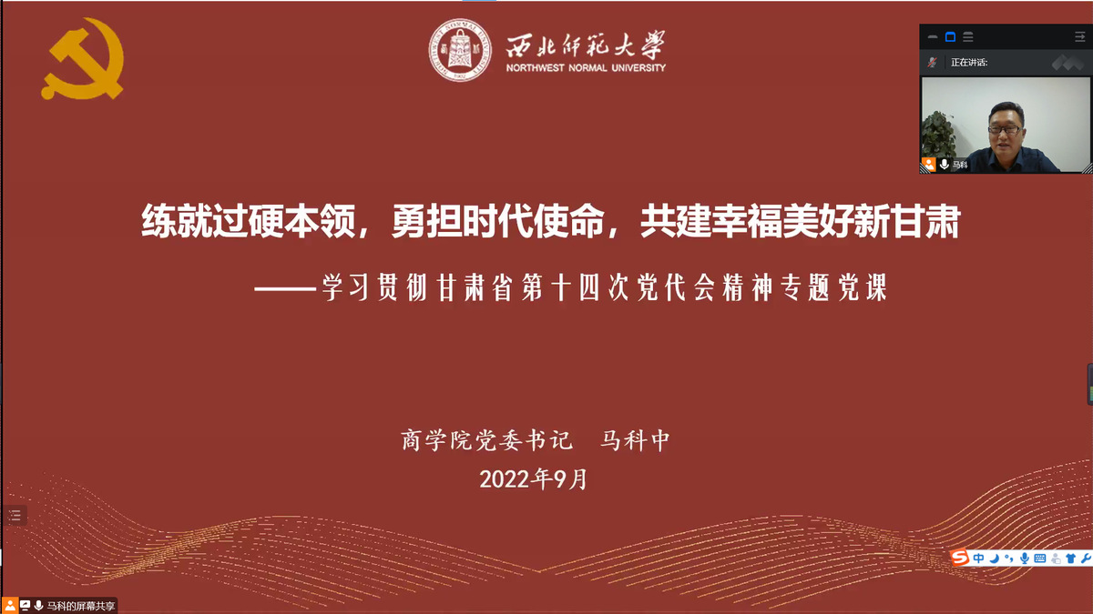 2022年9月28日晚,商公司党委书记马科中在线讲授题为“练就过硬本领,勇担时代使命,共建幸福美好新甘肃——学习贯彻甘肃省第十四次党代会精神”专题党课,全体员工党员、入党积极分子在线聆听了党课。