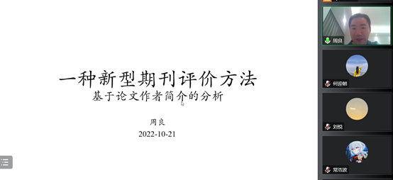 报告过程中,周良老师分享了本人近期发表的一篇文章。文章提出:期刊评价对个人学术晋升、学术部门发展、大学图书馆咨询服务、期刊质量提升等都具有重要意义。传统的评价学术期刊质量的方法有两类,分别是文献计量指标表和专家评议法,虽各有优势但仍存在局限性。基于此,文章结合显示性偏好法的优点,提出了一种新的期刊评价方法——基于论文作者简介中披露信息的期刊评价方法。该方法本质上利用领域内专家知识,通过对领域内主流期刊上发表过论文的作者自我简介信息挖掘,客观获取专家对主流期刊排序的投票,并对该投票信息进行归纳计算,得到各期刊的作者投票得分,以此得分对该领域的期刊进行排序。文章利用该方法分别对国际信息系统领域和市场营销领域的重要期刊进行了分析,检验了该方法的有效性和稳健性。报告结束后,在线教师及研究生就文本数据的识别和收集、投票信息指标的构建和匹配、期刊影响因子的选取和比较等问题与周老师进行了互动探讨,周老师均予以耐心、细致的解答。
