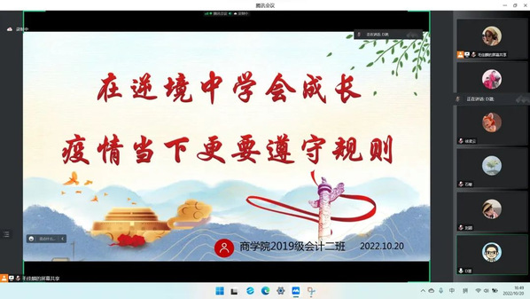2022级工商管理1班班会上,班主任薄慧敏老师分别从“忆往昔”“看今朝”“望未来”三方面引导同学们如何在疫情防控环境下调整心态,用良好的精神风貌面对学习和生活中遇到的挫折和挑战,在逆境中成长;随后,同学们用不同方式分享了参与公司疫情防控志愿服务工作的心得体会。商公司党委书记马科中对同学们提出了几点期望:希望同学们学会在不同环境中适应、改变,直至获得成长;无论在什么情况下,都要遵从自己的内心,把握好重视学业的不变准则,不断进步,提高综合能力。