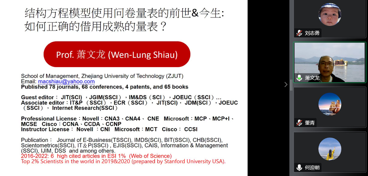 2022年10月25日,应williamhill英国威廉希尔商公司邀请,浙江工业大学williamhill英国威廉希尔萧文龙教授为公司师生在线作题为《结构方程模型使用问卷量表的前世&今生:如何正确借用成熟的量表?》的学术报告。报告由何迎朝副经理主持,公司领导、专任教师、研究生及其他公司和外校师生共300人聆听了报告。此次报告为williamhill英国威廉希尔120年双甲子校庆、williamhill英国威廉希尔商公司10周年院庆系列学术活动及研究生学术月活动之一。