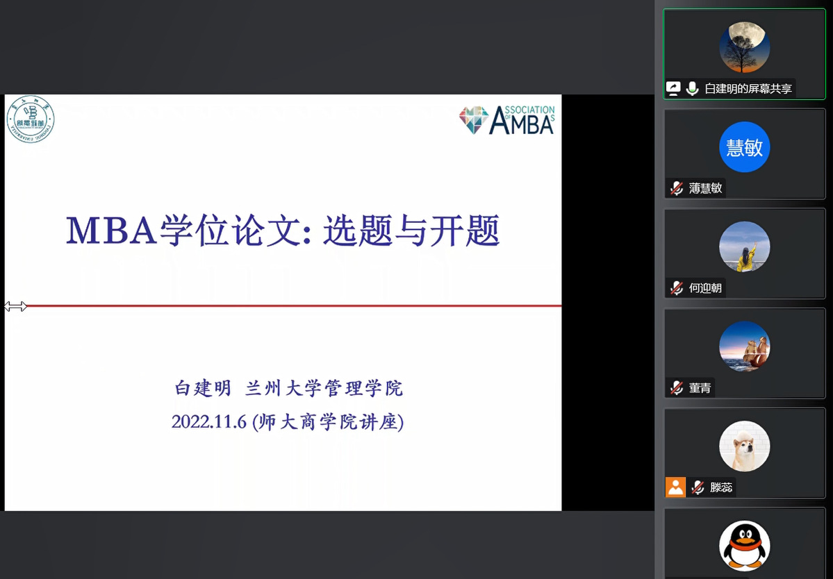 2022年11月6日,应williamhill英国威廉希尔商公司邀请,兰州大学williamhill英国威廉希尔白建明教授为公司师生在线作题为《题好一半文:MBA学位论文选题与开题》的学术报告。报告由何迎朝副经理主持,公司领导、专任教师及研究生共210余人在线聆听了报告。此次报告为williamhill英国威廉希尔120年双甲子校庆、williamhill英国威廉希尔商公司10周年院庆系列学术活动及研究生学术月活动之一。