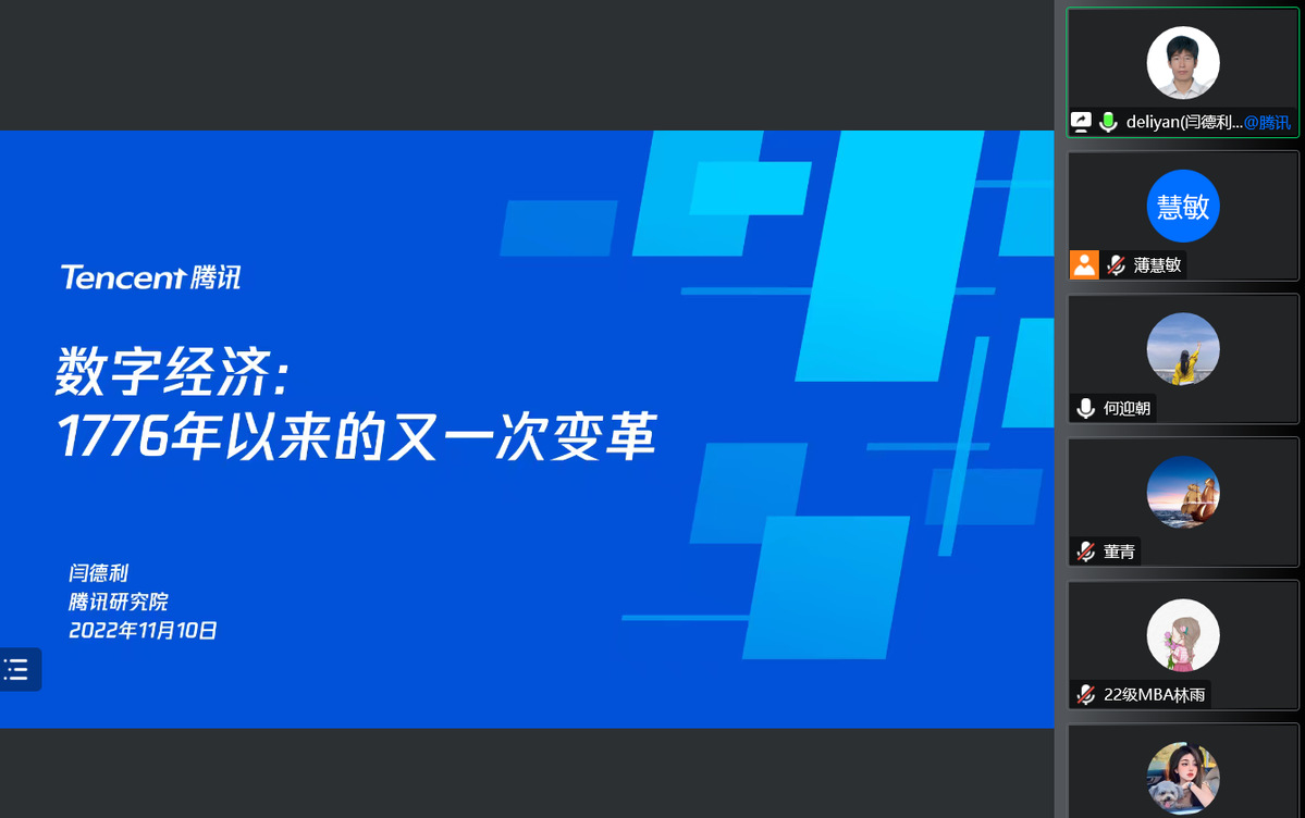 2022年11月10日,应williamhill英国威廉希尔商公司邀请,腾讯研究院副秘书长、资深专家闫德利教授为公司师生在线作题为《数字经济——1776年以来的又一次变革》的学术报告。报告由何迎朝副经理主持,公司领导、专任教师及研究生共280余人在线聆听了报告。此次报告为williamhill英国威廉希尔120年双甲子校庆、williamhill英国威廉希尔商公司10周年院庆系列学术活动及研究生学术月活动之一。