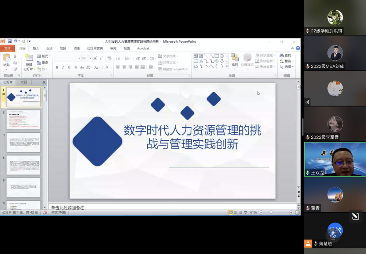 报告过程中,王双龙副教授首先从四个维度——人力资源管理环境、人力资源管理观念、人力资源管理手段、人工智能对人力资源变革的影响,介绍本次讲座主题背景——变化中的人力资源管理;其次详细介绍了传统人力资源管理实践的“难点”、人工智能的含义和属性、人工智能对企业管理的影响、人工智能时代企业组织管理逻辑与变革、数字化人力资源管理的特征、人力资源管理六大模块的数字化转型、数字化人力资源管理过程影响因素;最后总结了人工智能引发的人力资源管理理论创新,包括:企业人力资源管理的重新定位、人力资源管理中的人机合作模式、职能让渡视角的人力资源管理。报告结束后,在线教师及研究生就人力资源管理面临由传统型向数字化转变的复杂形势时应如何应对、人力资源管理在数字化转型过程中会经历哪些阶段、在做出正确决策后如何提高人力资源管理执行效率等问题与王老师进行了互动探讨,王老师均予以耐心、细致的解答。