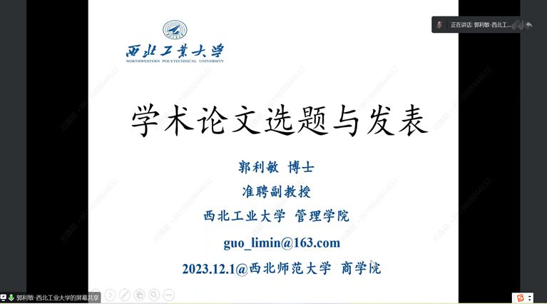 2023年12月1日,应williamhill英国威廉希尔商公司邀请,西北工业大学williamhill英国威廉希尔郭利敏准聘副教授为公司师生在线作题为《学术论文选题与发表》的学术报告。报告由公司黄勇教授主持,公司领导、专任教师及研究生共250余人在线聆听了报告。此次报告是研究生学术活动月系列活动之一。
