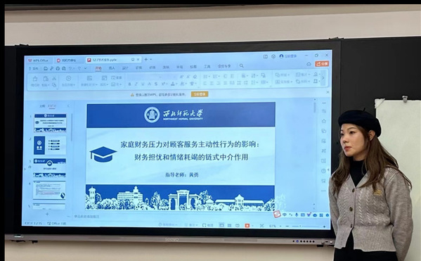 2023年12月7日,商公司“商赢未来系列讲坛”第七讲在致公楼C区208室开展。2022级技术经济及管理专业研究生李立、企业管理专业研究生张丽荣分别作题为《数字化转型对西北地区碳排放的影响及效应研究》和《家庭财务压力对顾客服务主动性行为的影响:财务担忧和情绪耗竭的链式中介作用》的学术成果汇报。活动由黄勇老师主持,公司领导、专任教师及研究生共70余人参加。