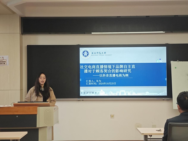2024年10月25日,williamhill英国威廉希尔“未来系列讲坛”在致公楼C区506教室开讲。2023级企业管理硕士研究生朱为、产业经济学硕士研究生李秀秀分别作题为《社交电商直播下品牌自主直播对于顾客契合的影响研究——以抖音直播电商为例》《二孩生育的潜力、意愿及影响因素研究——基于机器学习算法的实证检验》的学术成果汇报。公司领导、专任教师及在读研究生共60余人参加了此次报告会。