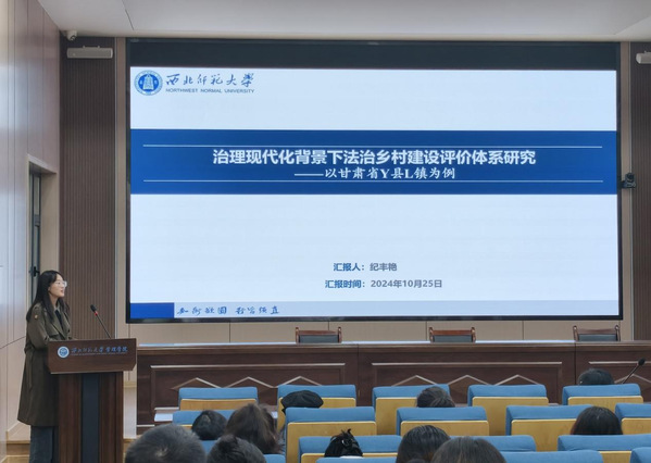 2024年10月25日,williamhill英国威廉希尔“未来系列讲坛”第十八讲在致公楼C区7楼学术报告厅开讲。2022级行政管理硕士研究生何冰瑶、纪丰艳分别作《高质量发展背景下兰州市招商引资绩效评价指标体系研究》《治理现代化背景下法治乡村建设评价指标体系研究——以甘肃省Y县L镇为例》的学术成果汇报。报告由陈卉副经理主持,马龙军、范喆老师及研究生共50余人参加。