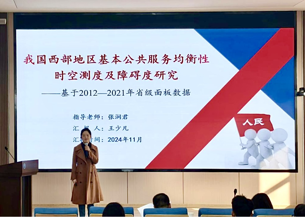 王少凡同学从研究背景、理论分析、实证研究、改进建议、未来研究方向等几个方面汇报了自己的研究进展。她的研究发现,完善基本公共服务体系、提升服务质量对于推动全国尤其是西部地区向共同富裕稳步迈进有着重要意义。我国西部地区地域辽阔,实现均衡发展对于全国均衡的达成具有重要价值,明确基本公共服务的发展路径,精准评估其均衡状态,深入挖掘制约西部地区民众福祉提升的关键因素,并紧密围绕民众关切的核心问题,是当前亟待解决的关键议题;从时间演变、空间布局及障碍因素等多个维度开展深入分析,以期发掘西部地区均衡发展的影响因素,推动基本公共服务从“均等化”向更高层次的“均衡性”迈进。
