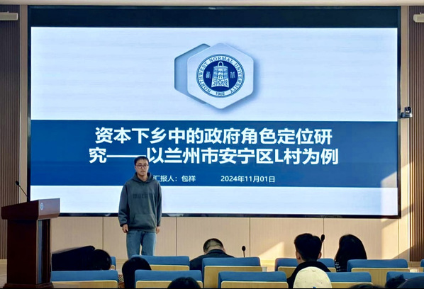 包祥同学的学术成果汇报从研究背景、研究现状、相关理论框架、研究方法、案例分析、对策建议等几个方面进行了阐述。他的研究认为,仅凭政府有限的财政资金支持,难以有效推进共同富裕和农业农村现代化的目标;因此,国家应积极鼓励工商资本投身乡村建设,以期加速乡村发展进程;基于政府角色理论,从政府视角出发,分析了基层政府在资本下乡过程中所扮演的角色及其发挥的关键作用,探索了如何构建基层政府、工商企业与农民之间的有效合作模式,以实现互利共赢,进而借助资本下乡的力量,推动乡村的全面发展和乡村振兴战略的深入实施。