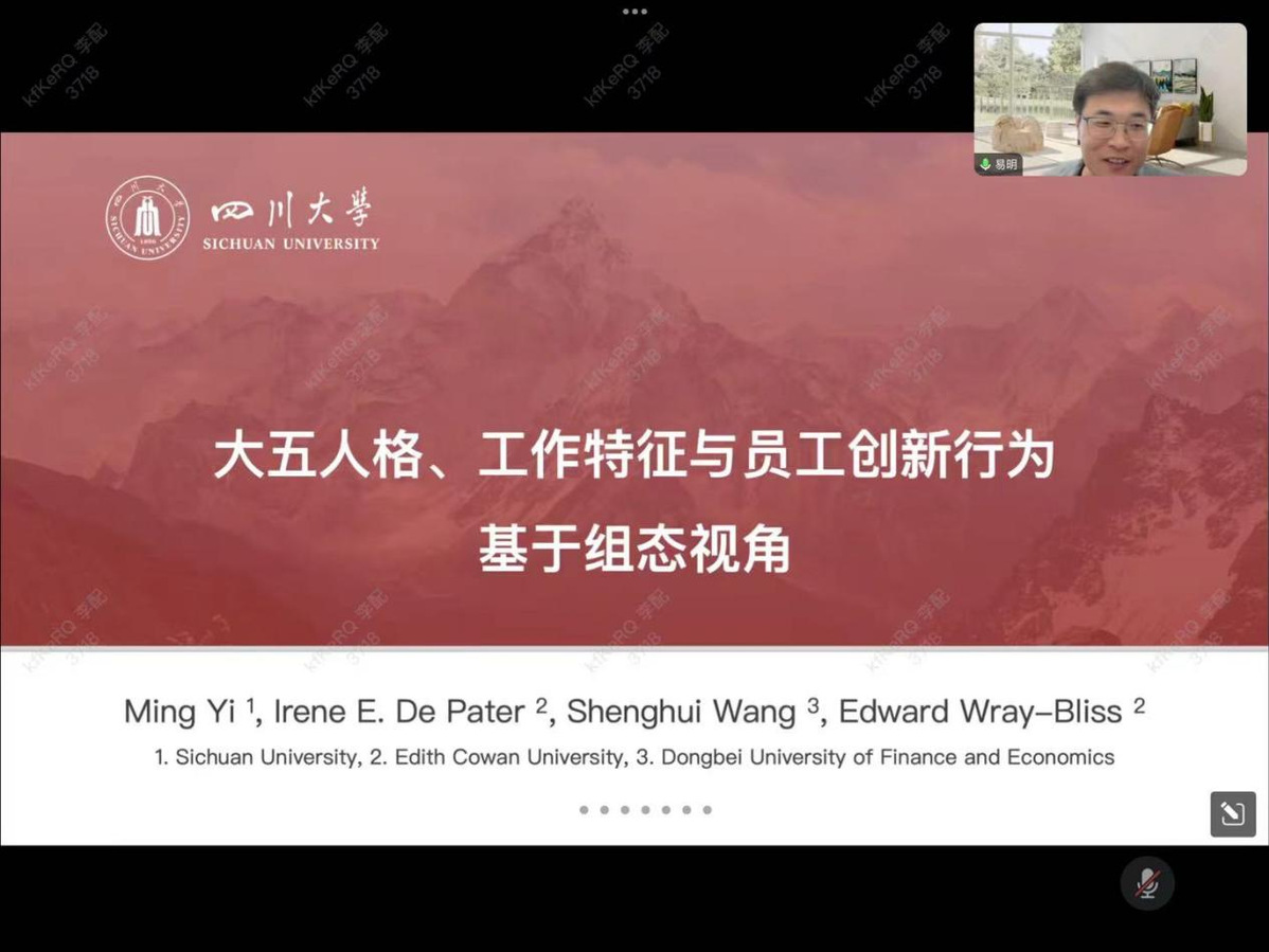 2024年11月8日,应williamhill英国威廉希尔邀请,四川大学商公司特聘副研究员易明老师为公司师生在线作题为《大五人格、工作特征与员工创新行为:基于组态视角》的学术报告。报告由黄勇教授主持,公司领导、专任教师及研究生共110余人在线聆听了报告。此次报告是研究生学术活动月系列活动之一。