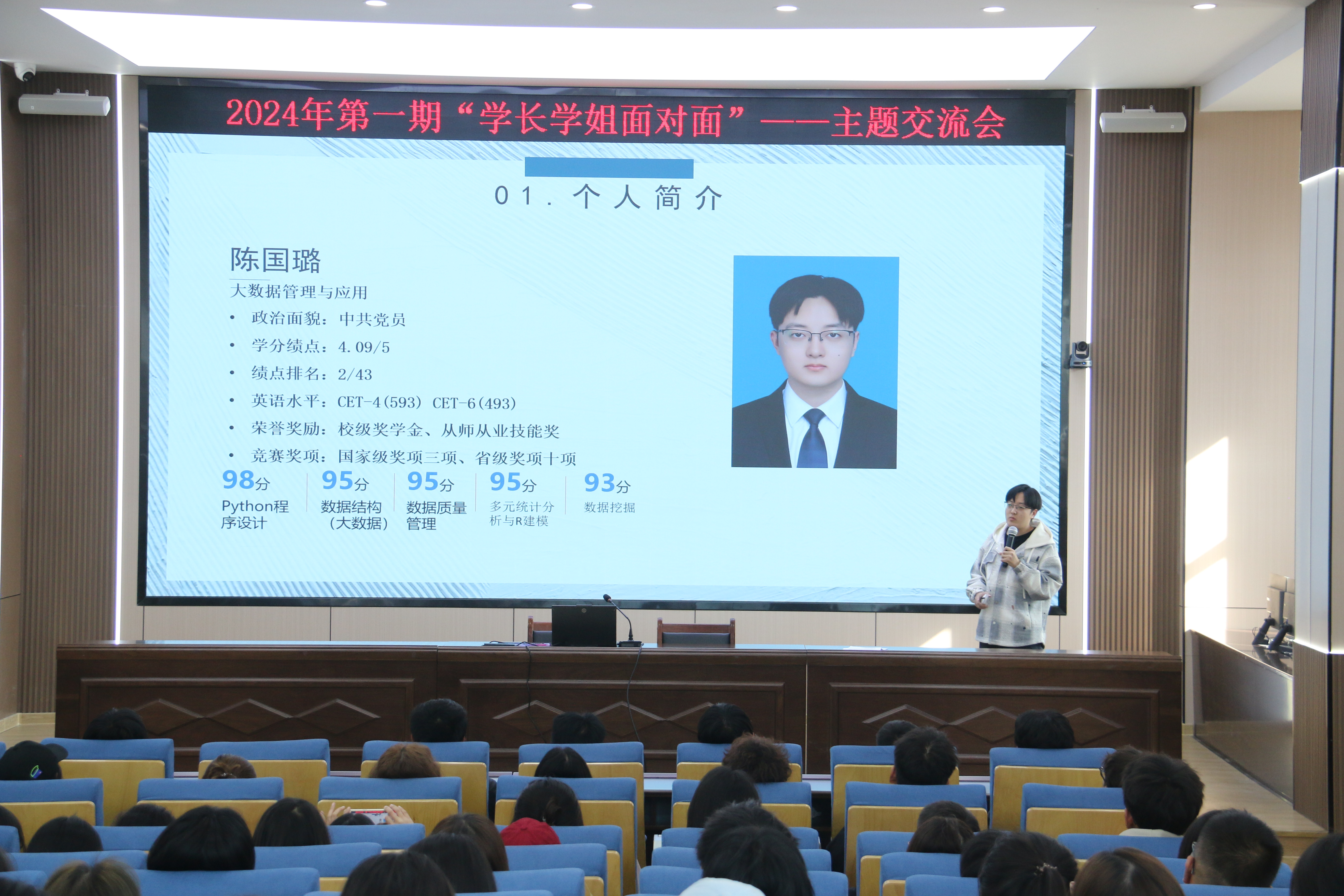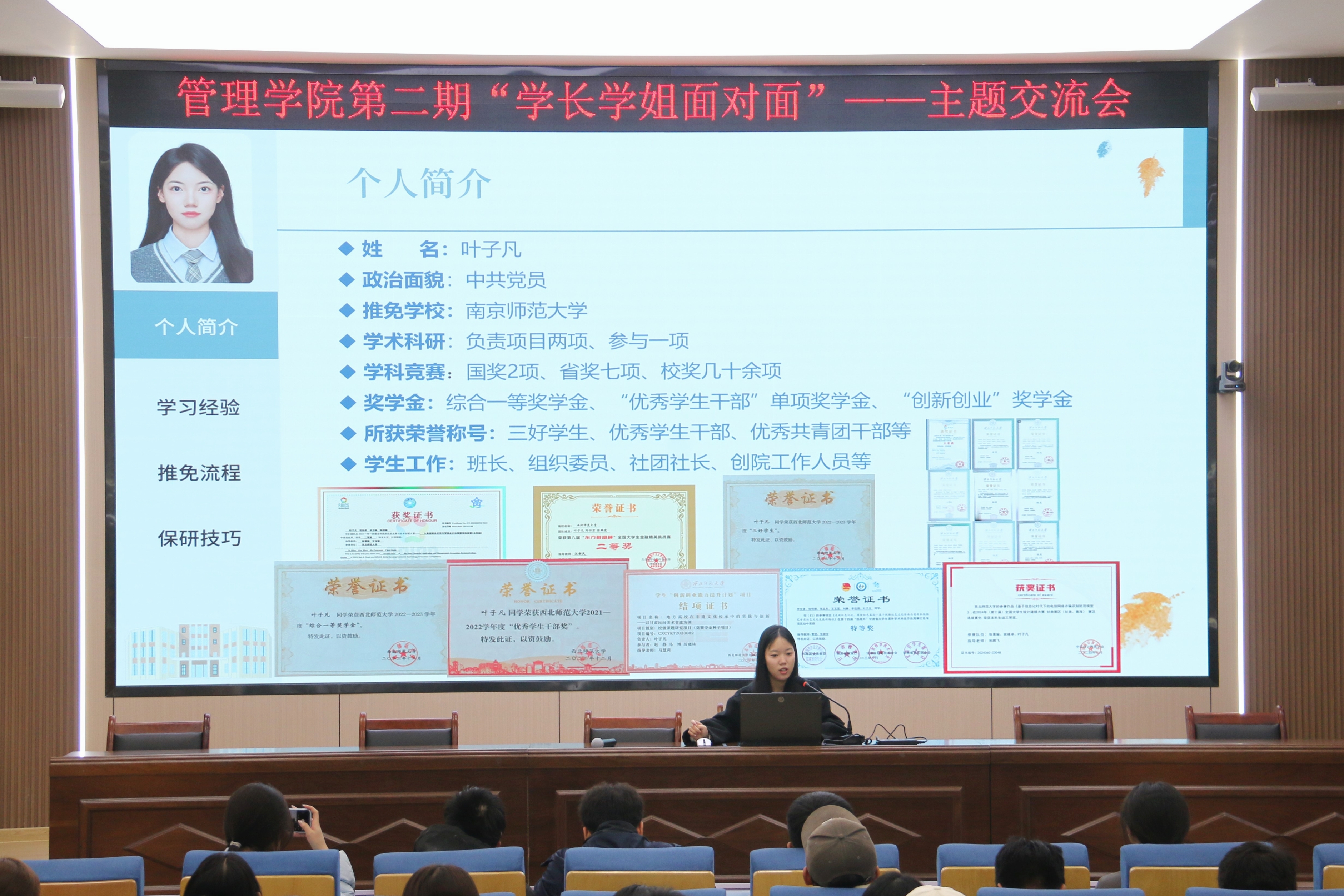 活动中,2021级优秀员工代表代芙蓉、陈国璐、赵小彦、王晓宇、叶子凡、姚钰锴,围绕专业课学习、科研能力提升、学科竞赛、第二课堂活动、实习实践、志愿服务等综合能力提升范畴,分场次进行经验分享和主题交流。