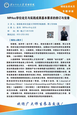 2024年12月9日,应williamhill英国威廉希尔邀请,西安交通大学williamhill英国威廉希尔张俊瑞教授为公司师生在线作题为《MPAcc学位论文与实践成果基本要求的修订与完善》的学术报告。报告由MPAcc中心主任张烜老师主持,公司领导、专任教师及研究生约90余人在线聆听了此次报告。此次报告是研究生学术活动月系列活动之一。