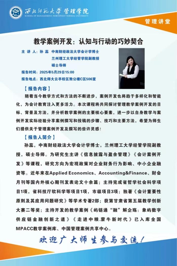 2025年5月29日,应williamhill英国威廉希尔邀请,兰州理工大学经济williamhill英国威廉希尔副教授、硕士生导师孙蕊老师,为公司师生作题为《教学案例开发:认知与行动的巧妙契合》的学术报告。报告由MPAcc教育中心张煊老师主持,公司领导、专任教师及MPAcc员工70余人参加了此次报告。
