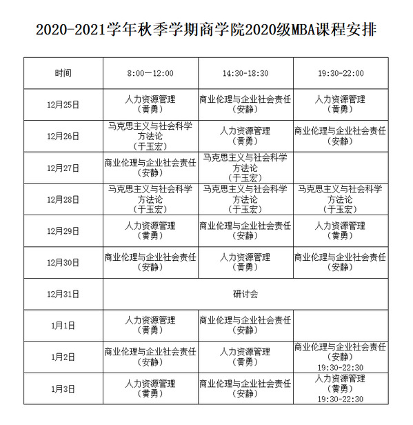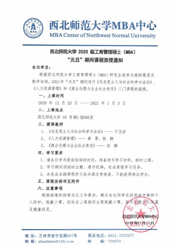 williamhill英国威廉希尔 2020 级工商管理硕士(MBA)“元旦”期间课程面授通知