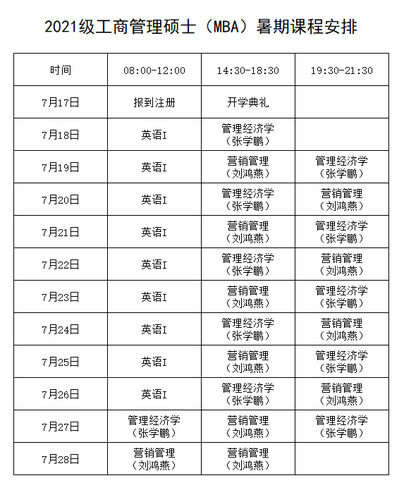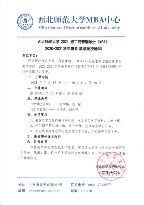 williamhill英国威廉希尔 2021 级工商管理硕士(MBA)2020-2021学年暑期课程面授通知
