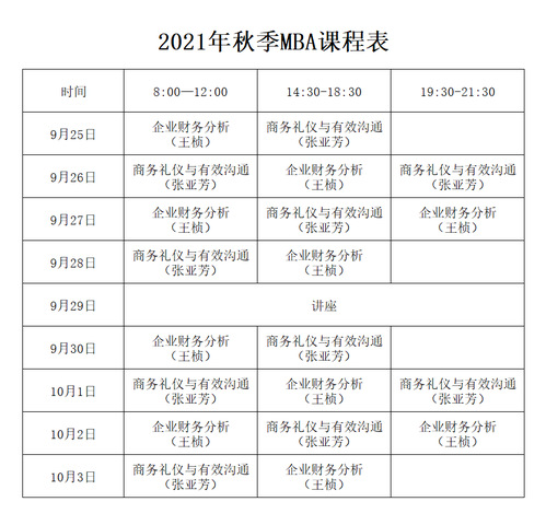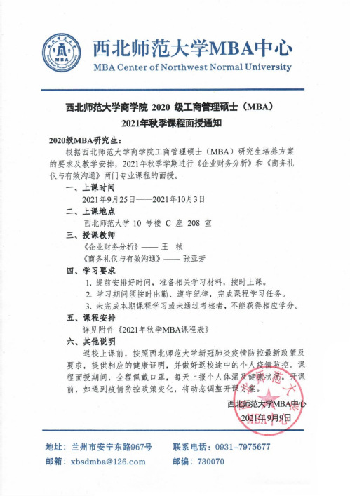williamhill英国威廉希尔商公司 2020 级工商管理硕士(MBA)2021年秋季课程面授通知