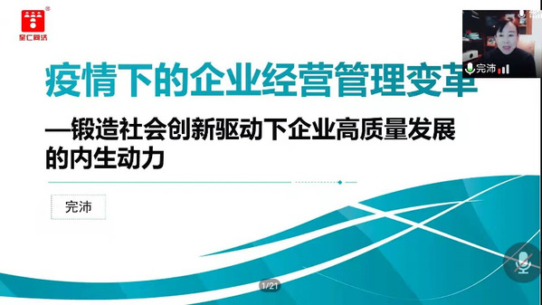 报告中,完沛从疫情状况下公共卫生的发展动向及对经济社会的影响入手,分析了企业高质量发展的内生动力来源、企业战略的价值和战略思维框架,解读了商业模式创新的重要性及互联网时代战略制定和商业模式创新的新动向。报告过程中,完沛用丰富生动的国内外案例,为同学们解析了疫情下企业经营管理发生的变革,并在线与同学们进行了的互动、探讨。