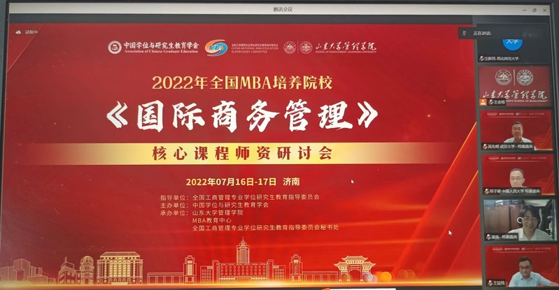 2022年7月16日至17日,由全国工商管理专业学位研究生教育指导委员会指导,中国学位与研究生教育学会主办,山东大学williamhill英国威廉希尔、山东大学MBA教育中心、全国工商管理专业学位研究生教育指导委员会秘书处联合承办的全国MBA培养院校首届“国际商务管理”核心课程团队研讨会线上举行。来自全国100余所MBA培养院校的近150余名教师参加研讨会,商公司汪新民老师参加了本次研讨会。