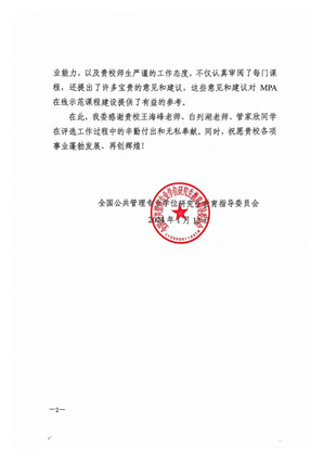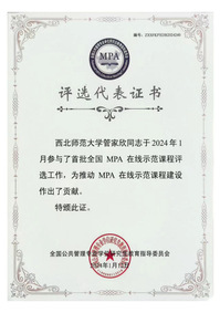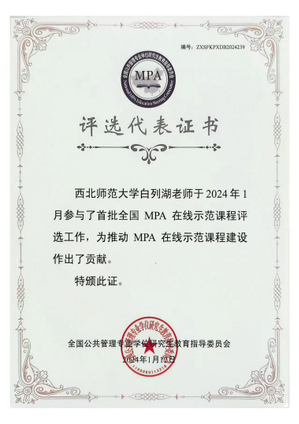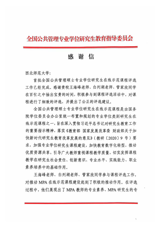 近日,全国公共管理专业学位研究生教育指导委员会(以下简称“全国MPA教指委”)向我院师生发来感谢信,对首批MPA在线示范课程评选工作中表现突出的王海峰老师、白列湖老师以及2022级MPA(1)班的管家欣同学给予了高度评价和认可。他们在课程评选过程中,不仅展现了对课程的深入理解和严谨态度,还提出了多项公正的评选建议,对优化和推动公共管理学科的课程建设发挥了积极作用。