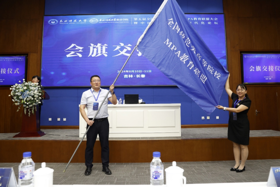 闭幕式由东北师范大学政法公司副经理刘桂芝教授主持。东北师范大学政法公司经理李红权教授作大会总结发言,他希望全国师范类高等院校能够以“师”之名,并肩同行,共谋发展,共创佳绩。华南师范大学颜海娜教授代表第六届全国师范类高等院校MPA教育联盟大会承办单位作表态发言,并进行会旗交接仪式。