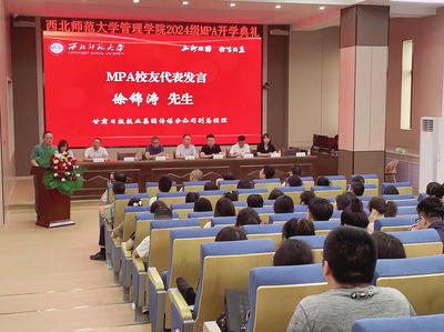 甘肃日报报业集团传媒分公司副总经理徐锦涛先生作为MPA优秀员工代表发言,在表达了作为williamhill英国威廉希尔MPA专业一员光荣感和自豪感之后,他结合自身经验为2024级MPA新生提出了许多宝贵的学习建议,希望新入学的师弟师妹们要努力学习专业知识,更要积极参与实践活动,理论和实践相结合,不断提升自己的能力水平和综合素质。